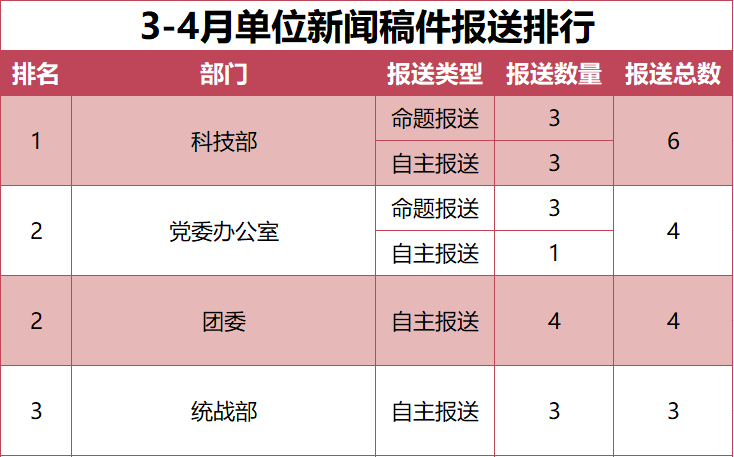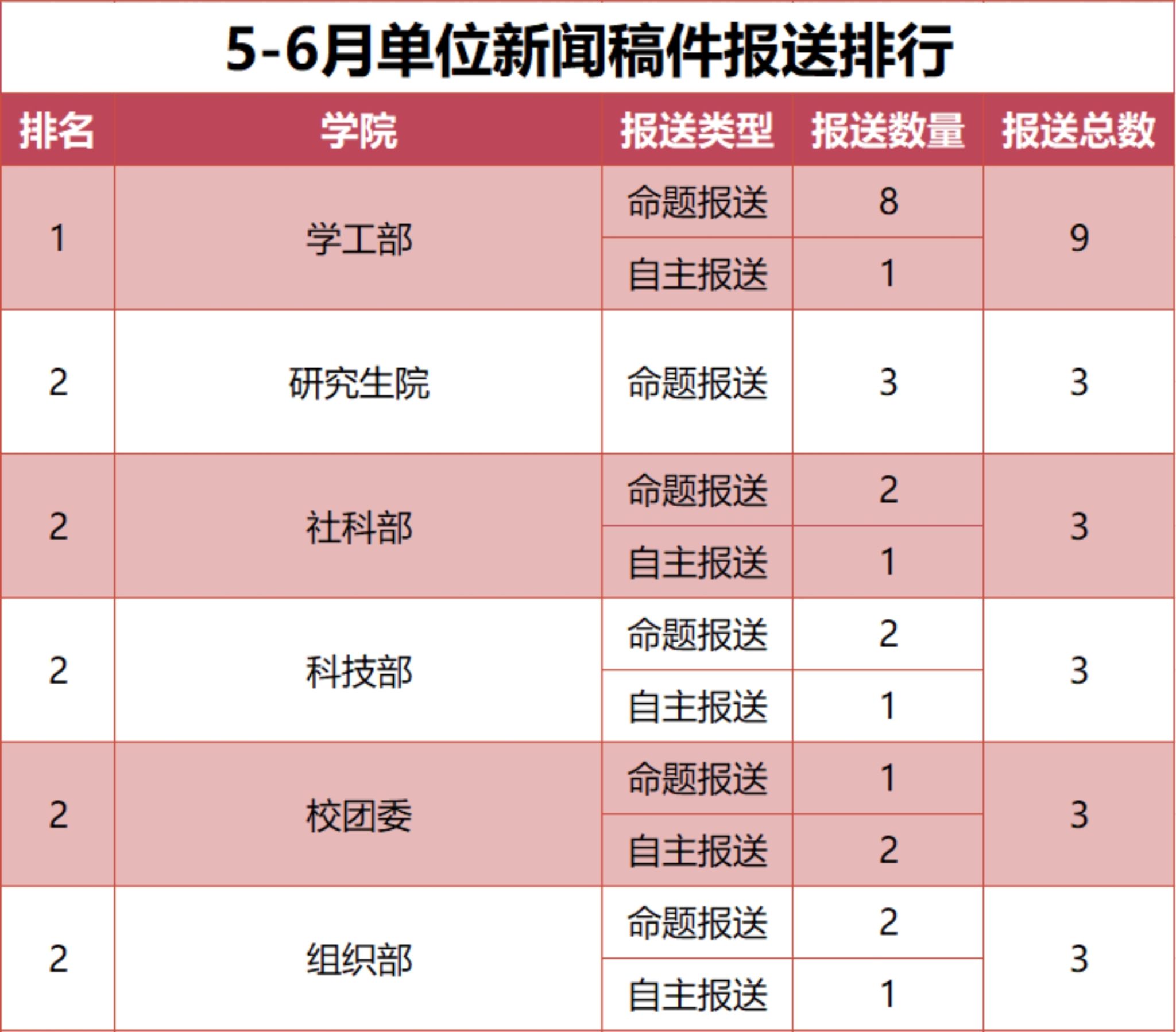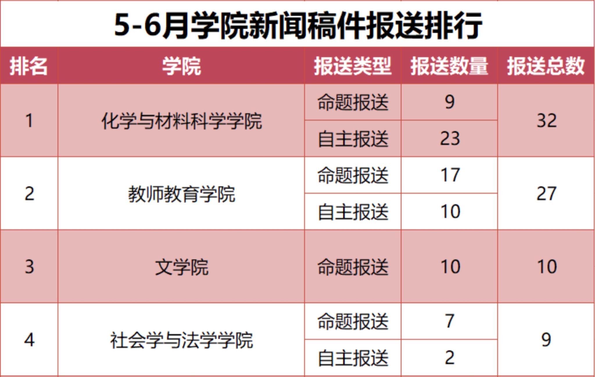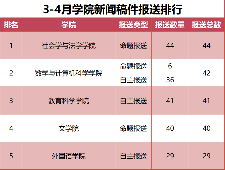 为进一步加强学校新闻宣传工作,学校完善了新闻宣传稿件报送机制,现将2025年3-4月、5-6月新闻宣传稿件报送排行予以公布。(数据统计截止时间:2025年6月30日)