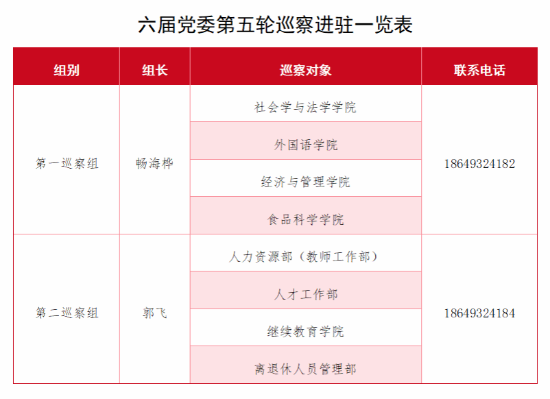 根据校党委统一部署,10月10日至10月11日,六届党委第五轮巡察组已完成对社会学与法学学院、外国语学院、经济与管理学院、食品科学学院、人力资源部(教师工作部)、人才工作部、继续教育学院、离退休人员管理部等8家单位的进驻工作。