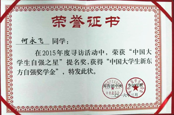 何永飞同学获2015年“中国大学生自强之星提名奖”
